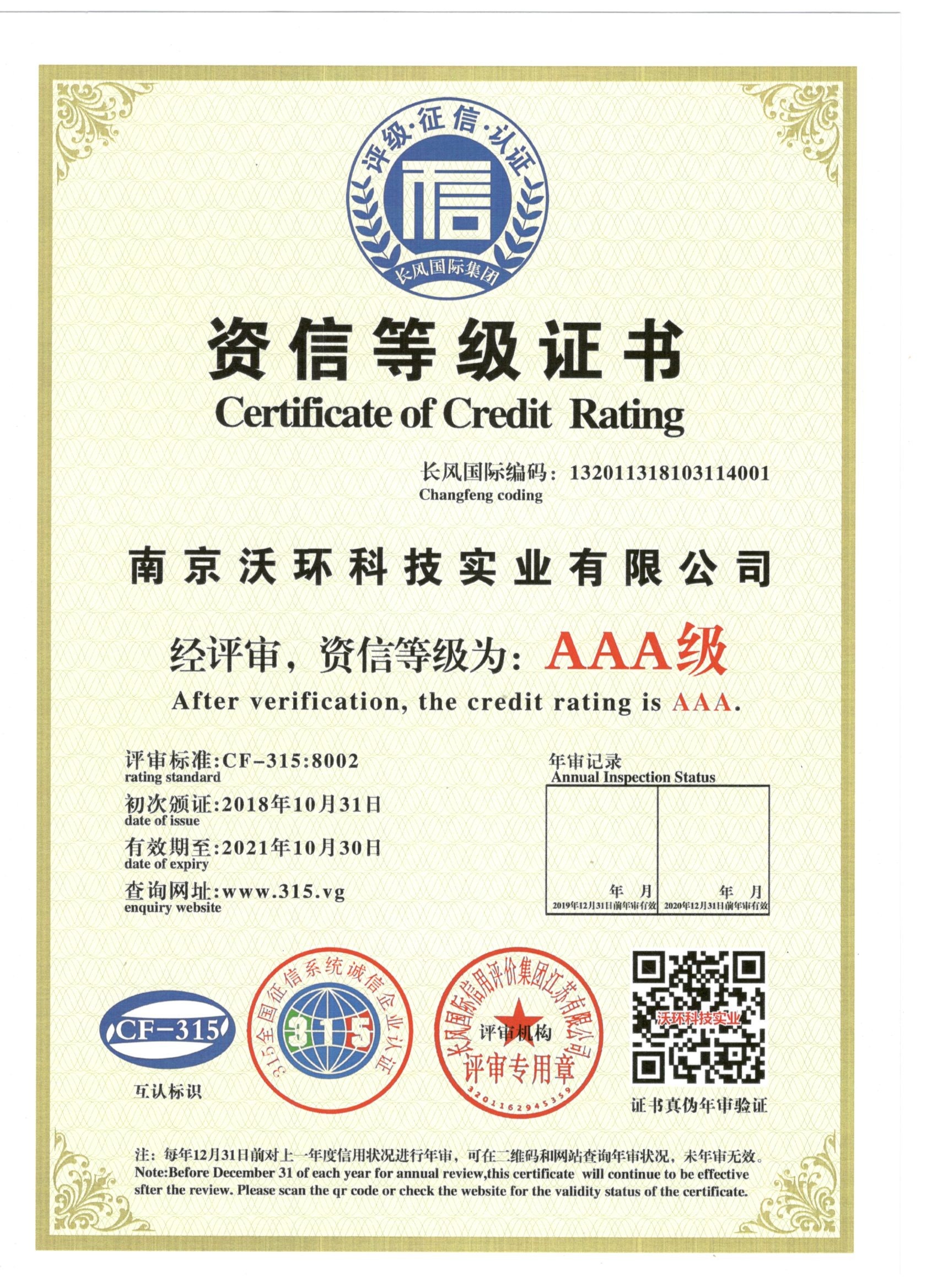 熱烈祝賀南京沃環(huán)公司被專業(yè)評審機構(gòu)-長風(fēng)國際集團評為AAA級資信等級